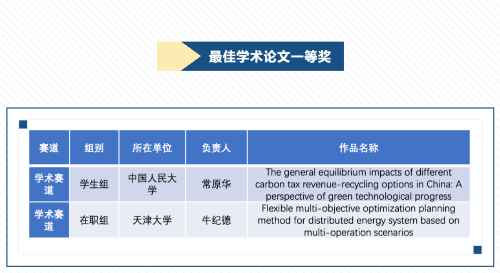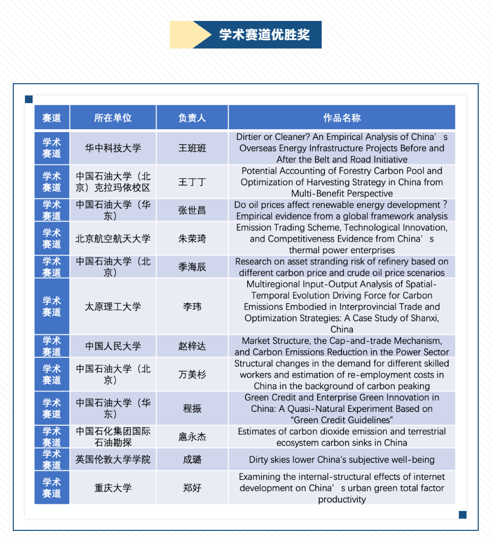 环境性爱网站2020级博士研究生常原华经初审、决赛,从来自包括金砖国家中的中国、俄罗斯、印度、巴西,以及哈萨克斯坦、厄瓜多尔、伊拉克、英国、法国、日本等32个国家的264篇学术赛道作品中脱颖而出,以“The general equilibrium impacts of different carbon tax revenue-recycling options in China:A perspective of green technological progress”为题目获得“最佳学术论文奖”公开评选活动学术赛道一等奖,2019级本科生赵梓达荣获学术赛道优胜奖。