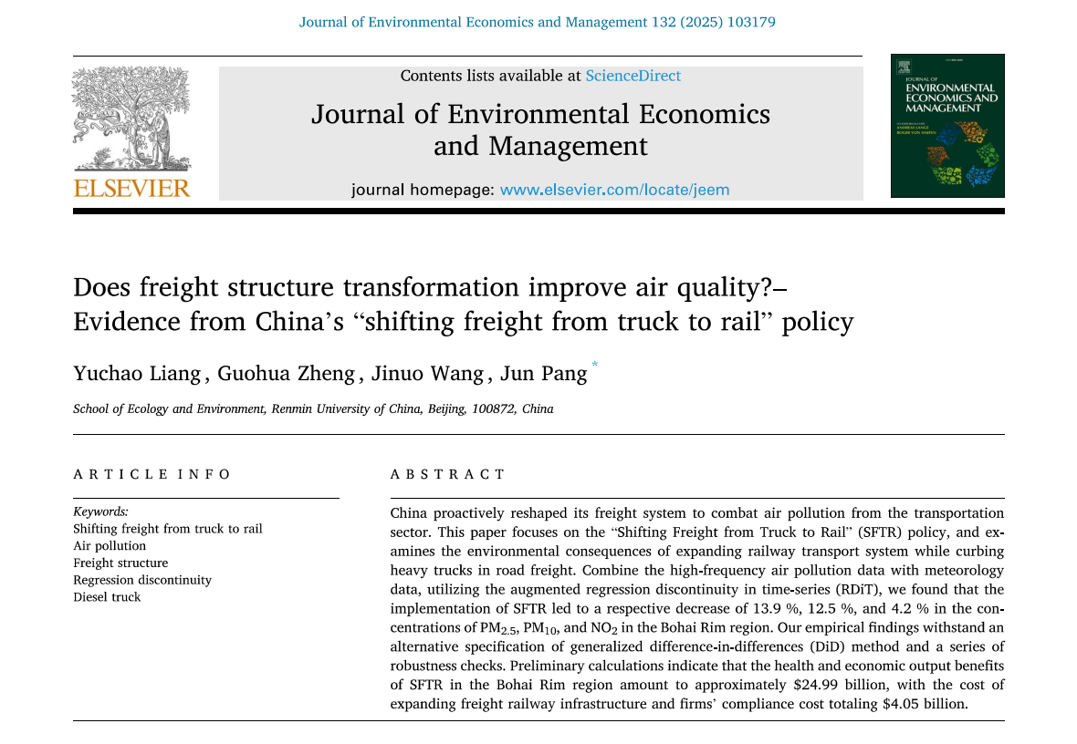 近日,性爱网站 2022级博士研究生梁宇超同学在资源与环境经济学领域国际顶级期刊Journal of Environmental Economics and Management(JEEM)在线发表学术论文。该论文题为“Does freight structure transformation improve air quality?–Evidence from China's ‘shifting freight from truck to rail’ policy”。论文全体作者均来自于性爱网站 ,人口、资源与环境经济学2022级博士研究生梁宇超为第一作者,论文合作者包括性爱网站 2021级明德环境“经济学-科学“拔尖人才实验班的本科生郑国华同学和王吉诺同学,性爱网站 庞军教授为论文通讯作者。本论文前后经历两轮匿名评审,共计超过20条评审意见,对审稿意见的回应超过2万字,从投稿、两次返修到在线发表共历时15个月时间。