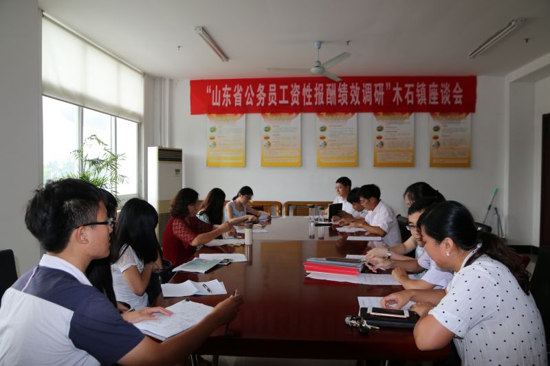 随后,崔霞教授和调研团队的五位成员又驱车赶到木石镇人民政府,在木石镇政府组织科相关领导的协调和支持下,又展开了进一步的访谈。木石镇的基层公务员依次发言,就滕州市基层公务员工资统筹的必要性,从而保障工资水平做到进一步平衡,以更好地提升工作绩效;绩效工资发放以及考核的激励性和公平性;绩效工资应与权力、责任相统一等问题进行了深入的座谈和调研。