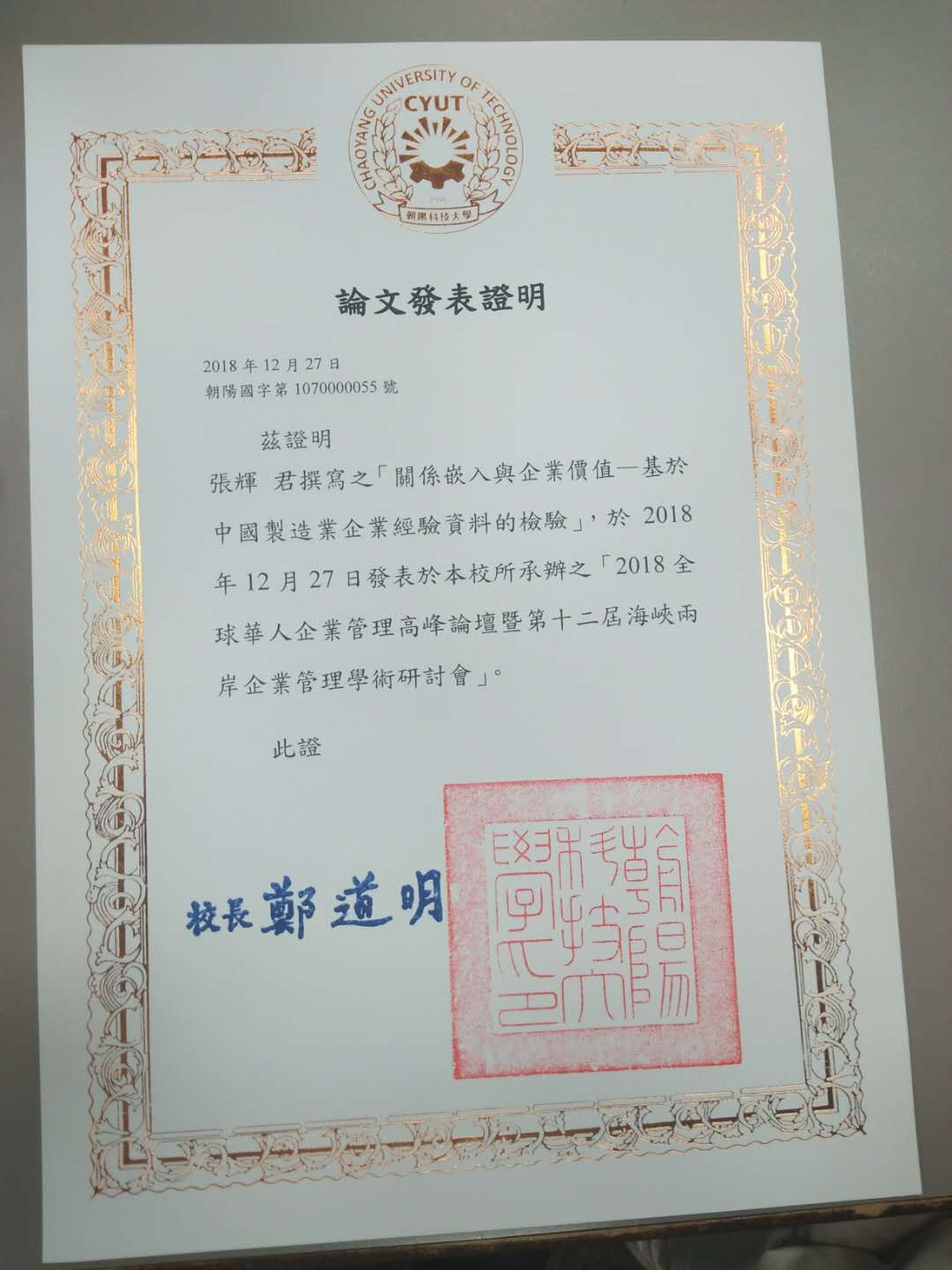 张辉同学于2018年12月26日-30日赴中国台湾朝阳科技大学参加“2018全球华人企业管理高峰论坛”,该论坛每年举办一次,是海峡两岸重要的学术沟通平台。本次论坛的主题是“智慧时代的企业创新”,分设了创新模式、组织创新与人资管理、行销管理、流通管理、金融科技、休闲管理、旅游管理、东方管理、电商管理、科技管理及其它有关议题。交流会上,张辉同学就申请并参加的性爱网站