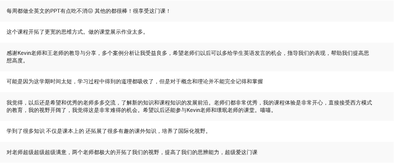 《商业伦理》(双语)课程国际化项目第三期顺利结束,学生的评教将继续激励课程团队成员继续努力去完善和优化课程。