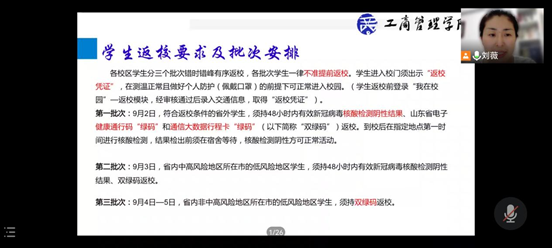 严格遵循学校的返校工作方案等相关文件和信息的规定,利用“我在校园”平台等方式,按照返校前学生个人健康情况调研、学生返校申请、省内外错时错峰返校等一系列流程来确保学生安全返校。细致的规定,严谨的步骤,为工商学子的平安返校铺就稳固的桥梁。