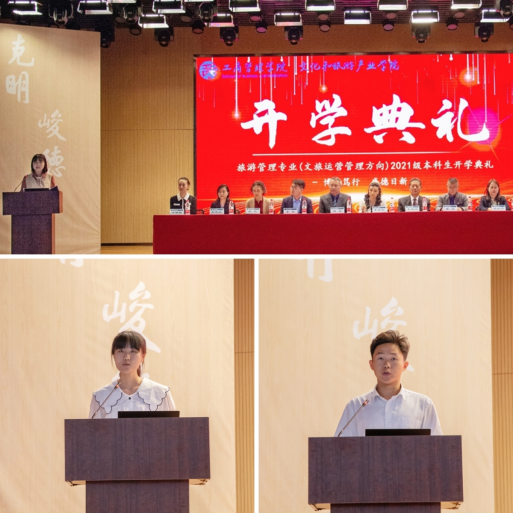 旅游管理专业推免生魏天雨、石珂蔚代表在校生向新同学表示欢迎。魏天雨以“书写青春篇章”为题,结合自身经历鼓励学弟学妹们勤奋自律、刻苦学习,积极参加社会实践,锻炼自我、提高自我。石珂蔚分享了自己的学习经历以及对旅游管理专业的理解和感悟,她鼓励学弟学妹们努力探索专业学习的乐趣和价值。2021级本科生朱君赫代表新生表达了对大学生活的美好憧憬和对专业学习和实践的期待。他表示要秉承山财大“克明峻德、格物致知”的校训精神,以全新的面貌规划学业和人生,以优秀学长学姐为榜样,以国家需要为奋斗之本,以知行合一为修身之本,珍爱年华、只争朝夕、博学笃行、追求卓越,立志成为山财大的骄傲!