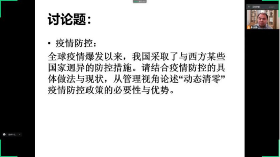 教师为保证教学质量,全体教师以系为单位展开教学研讨,认真探索如何应对疫情变化下的教学改革,从形式到内容都不断创新、反复斟酌、精益求精,确保每一节课都能够高质量完成。一方面,重建考核评价新机制,考核评价由“结果型”转向“过程型”。成绩评价采取线上评价和线下评价相结合、平时考核和期末考核相结合,注重对学习效果的检测和及时反馈,强调对学习过程的评估。另一方面,注重对学生进行心理疏导和人文关怀,及时回应学生诉求,积极推动强化课程思政建设,把战胜疫情、家国情怀、爱国主义精神和青年使命担当融入课堂教学,对学生正面引导,传递正能量。在《管理学》《国际企业管理》《商业伦理学》等课程中,通过与学生沟通、讨论、提问、分享等方式,将疫情防控和理论知识相结合,开展“伦理小课堂”环节,分析疫情期间学生的心理变化,疏解学生疫情期间可能产生的紧张情绪。
