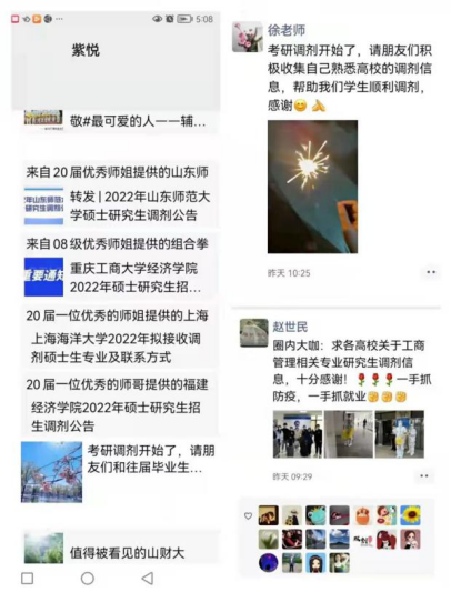 研究生复试工作的同时。面对愈加严峻的考研升学形势,在家中等待考研复试调剂的工商毕业班学生的诉求也不容忽视。对此,学院各领导老师及时摸排,精心指导,多措并举全力助力学生考研复试。赵世民等老师更是积极发动身边朋友收集自己熟悉高校相关专业研究生的调剂信息,不断向同学们提供各大高校的硕士研究生招生调剂公告。