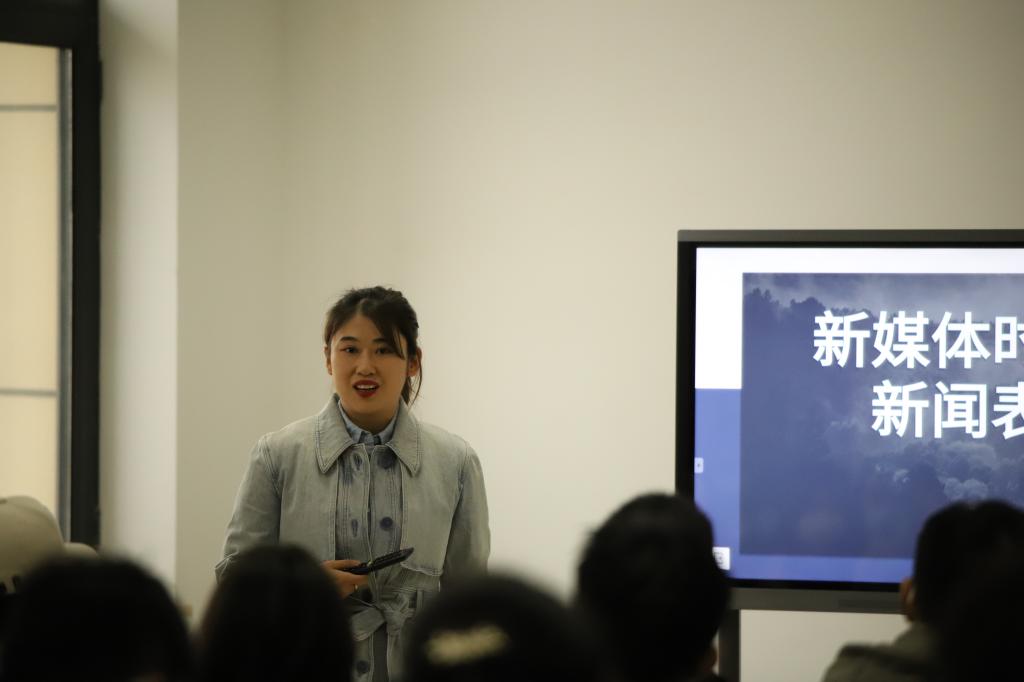 郑芷南围绕语言表达、应用文写作展开讲解,并延伸到视频制作、网络新媒体运营等新的技术方面。在讲解文字写作方面,她以新闻稿件为例,介绍了文章编排的基本结构、内容排序,强调了新闻导语的重要性,要抓住事件的精髓,呈现最重要的事实和亮点。在讲解运用视频制作表达时,郑芷南从文案的创立,视频拍摄的关注点,热点剪辑、画面处理三个方面展示了视频剪辑技巧,强调视频剪辑要保证事实清晰完整、力争画面能引起共鸣。关于新媒体运营,她说在新媒体时代,每个人都是内容的制造者和传播者,文章选题和内容输出要传递正能量,要提供价值感,让读者有所收获。