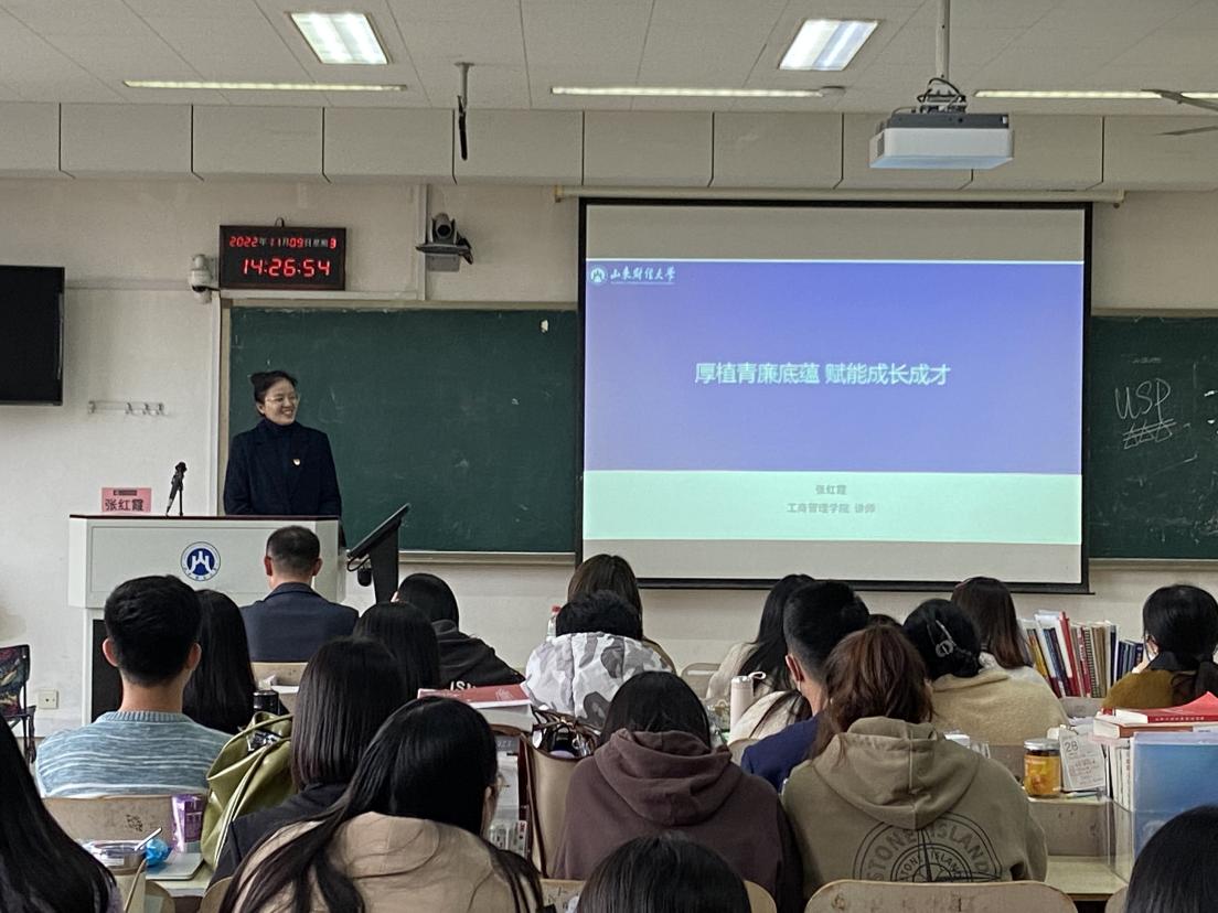 首先,王友春围绕大学生清廉教育的现实问题与挑战,结合具体案例,深入剖析了新时代大学生清廉教育的重要性,从国际国内廉政形势、廉洁教育的内涵、大学生廉洁教育的行为规范等方面进行系统讲解,引导学生要以廉为镜,认清廉洁修身的盲区,形成诚实守信、正直节约、崇廉拒腐的价值观;随后,张红霞以“厚植青廉底蕴 赋能成长成才”为题,带领全体学生学习了习近平总书记关于青年学生成长成才的重要思想,从青年学生的理想信念、价值取向、知识学习、意志品质、思维能力、创新精神、社会实践、使命担当等八个方面进行讲述,帮助学生充分认清形势、守住底线,进一步增强了学生的廉洁自律意识。