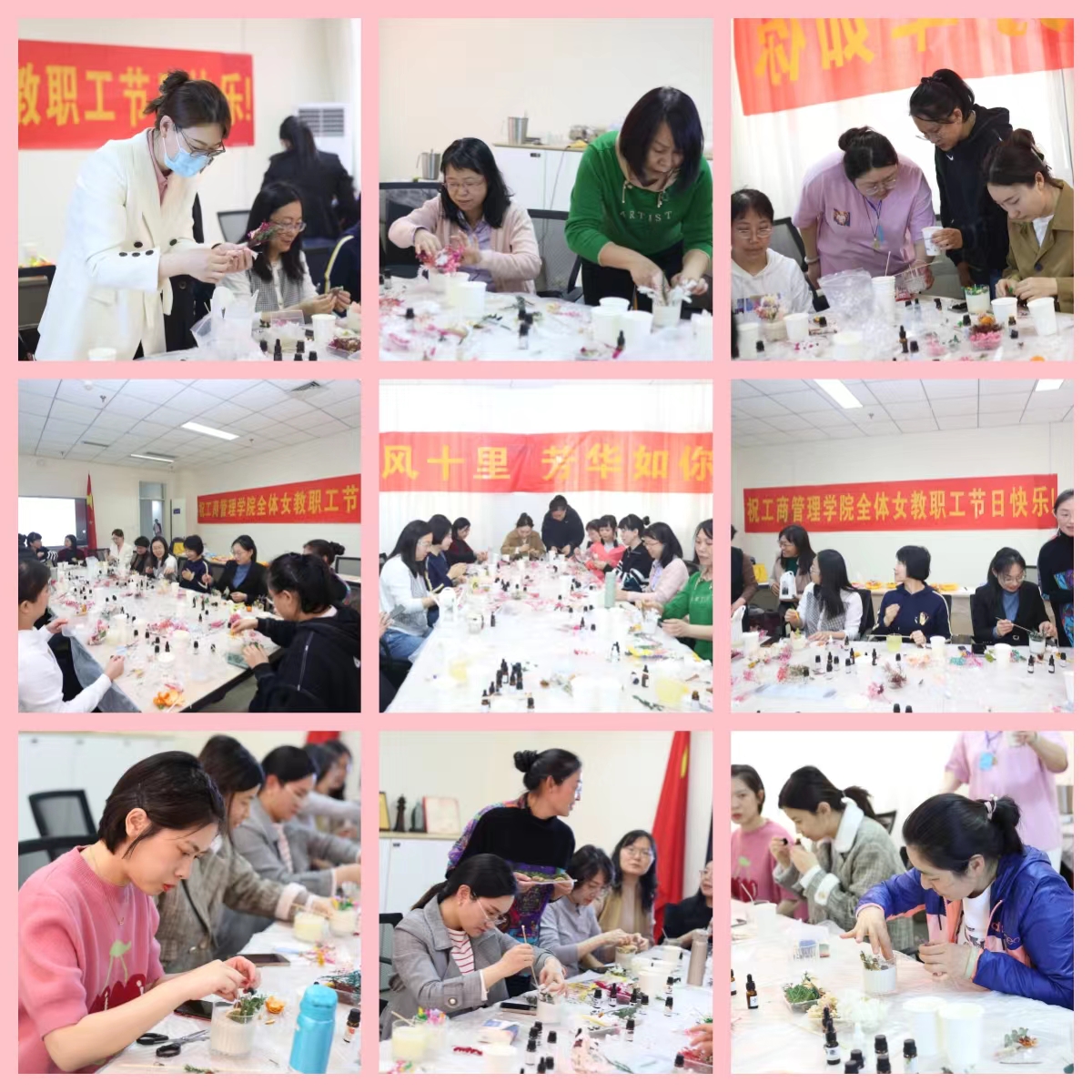 自中午13:40开始,学院女职工陆续到达活动地点。在专业人员详细讲解香薰蜡烛原材料、制作流程和注意事项后,每位女职工根据自身的喜好,亲自上手,设计并制作出各具特色、寓意优美的香薰蜡烛作品。制作过程中充满欢欣愉悦的笑声,相互借鉴的真诚交流。作品制作成功后,各位老师纷纷与自己的作品合照留念,留下美好回忆!