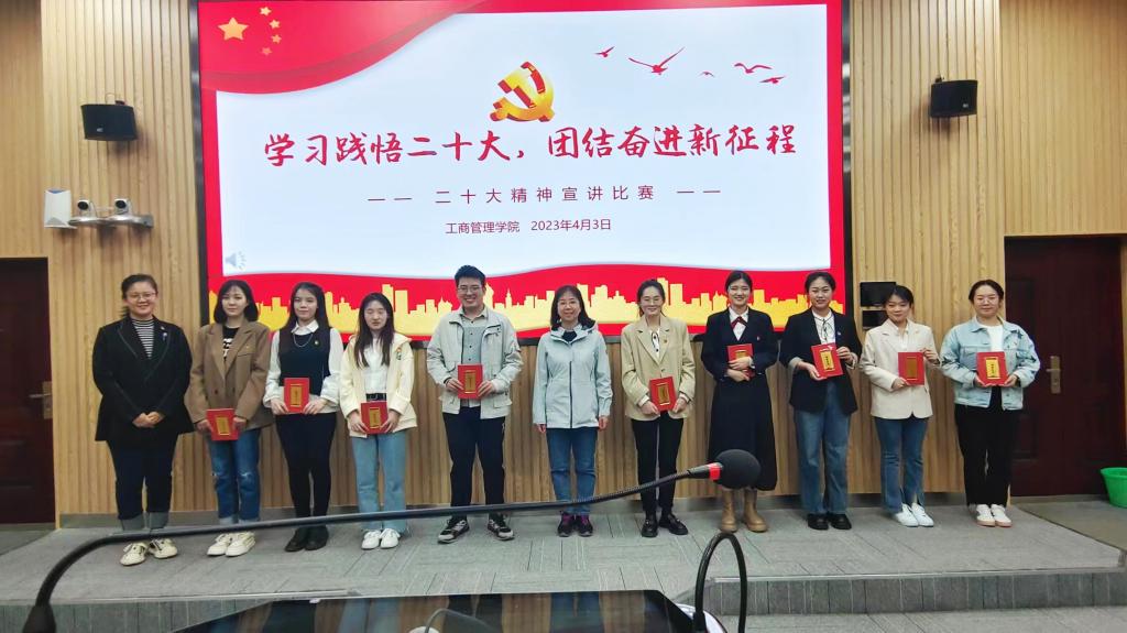 比赛过程中,参赛选手围绕党的二十大精神,结合自身学习和生活经历依次进行宣讲,纷纷表示要深入贯彻党的二十大精神,努力学习专业知识,提高专业水平,做有理想、敢担当、能吃苦、肯奋斗的新时代好青年,让青春在全面建设社会主义现代化国家的火热实践中绽放绚丽之花。最后,彭艳红和学院老师分别为获奖同学颁奖并合影。