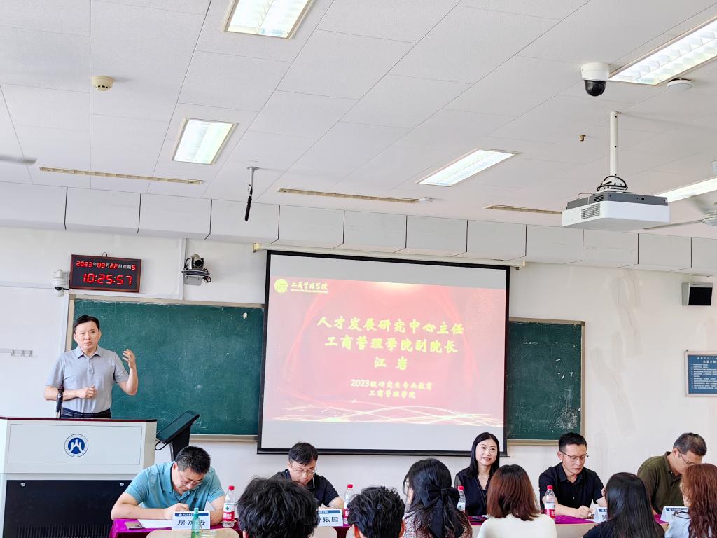 在逸夫楼218教室开展2023级研究生专业教育。人才发展研究中心主任、副院长江岩,工商管理系主任陈庆江,教学发展中心主任费振国,人力资源与组织行为系党支部书记、副主任房茂涛以及文化和旅游系主任于伟出席。活动由学院党委副书记彭艳红主持,2023级全体研究生参加。