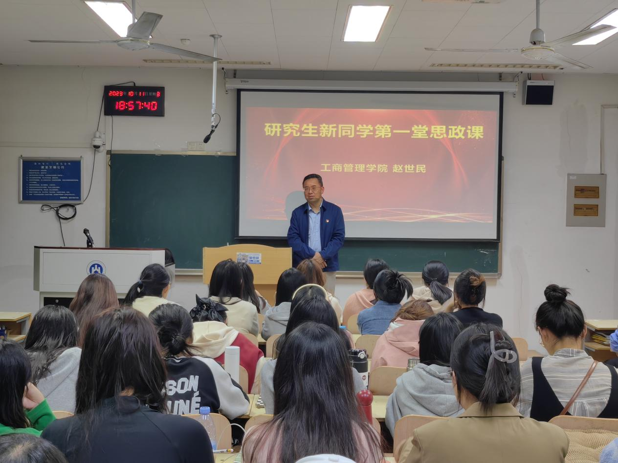 党委书记赵世民在逸夫楼206教室为2023级研究生新同学开讲了第一堂思政课。