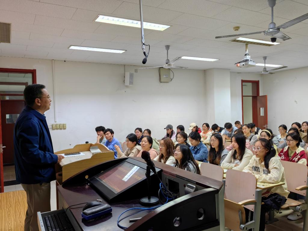 课堂上,赵世民结合学习党的二十大精神和习近平总书记关于青年工作的重要论述,指出当代中国青年生逢其时,施展才干的舞台无比广阔,实现梦想的前景无比光明。他勉励同学们,要争做有理想、敢担当、能吃苦、肯奋斗的新时代好青年,在未来的学业发展中踔厉奋发、勇毅前行、团结奋斗,让青春在全面建设社会主义现代化国家的火热实践中绽放绚丽之花。赵世民对2023级研究生新同学提出三点建议,第一,研究生在学习方面要有危机感和压力意识,加强自我管理、自我约束、自我服务,要有“坐冷板凳”写出好文章的能力,更要有“发奋学习搞科研”的意志力。第二,研究生要有意识的开展专业能力的拓展训练。在学习范围之外,进行开创性的实践锻炼。第三,青年学生要树立正确的心态,对自身有客观的认识,对挫折有理性的判断,不断提升吃苦耐劳的能力。