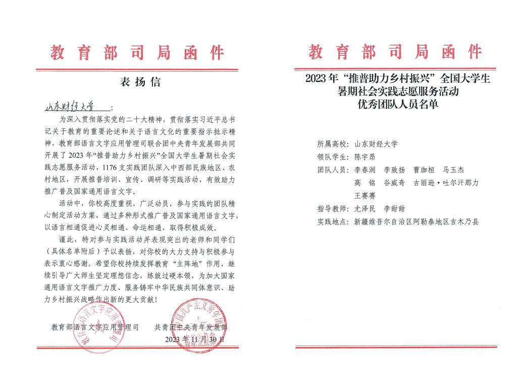 信中指出,学校高度重视、广泛动员,“赴新疆阿勒泰地区推普助力乡村振兴服务队”精心制定方案,通过多种形式推广普及国家通用语言文字,以语言相通促进心灵相通、命运相通,取得积极成效。