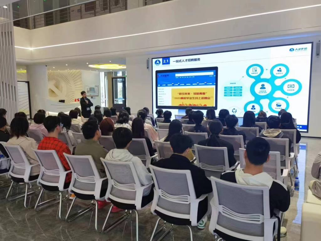 最后,师生们在公共会议厅听取了人才有价(山东)有限公司关于“人力资源和人力资本创新服务”的报告。报告人展示了该公司在人才数智化、人才招聘、产业人才大数据、管理咨询等方面的最新产品及服务,其中人才数智化平台的研发与上线,体现了人力资源服务发展的新动向。