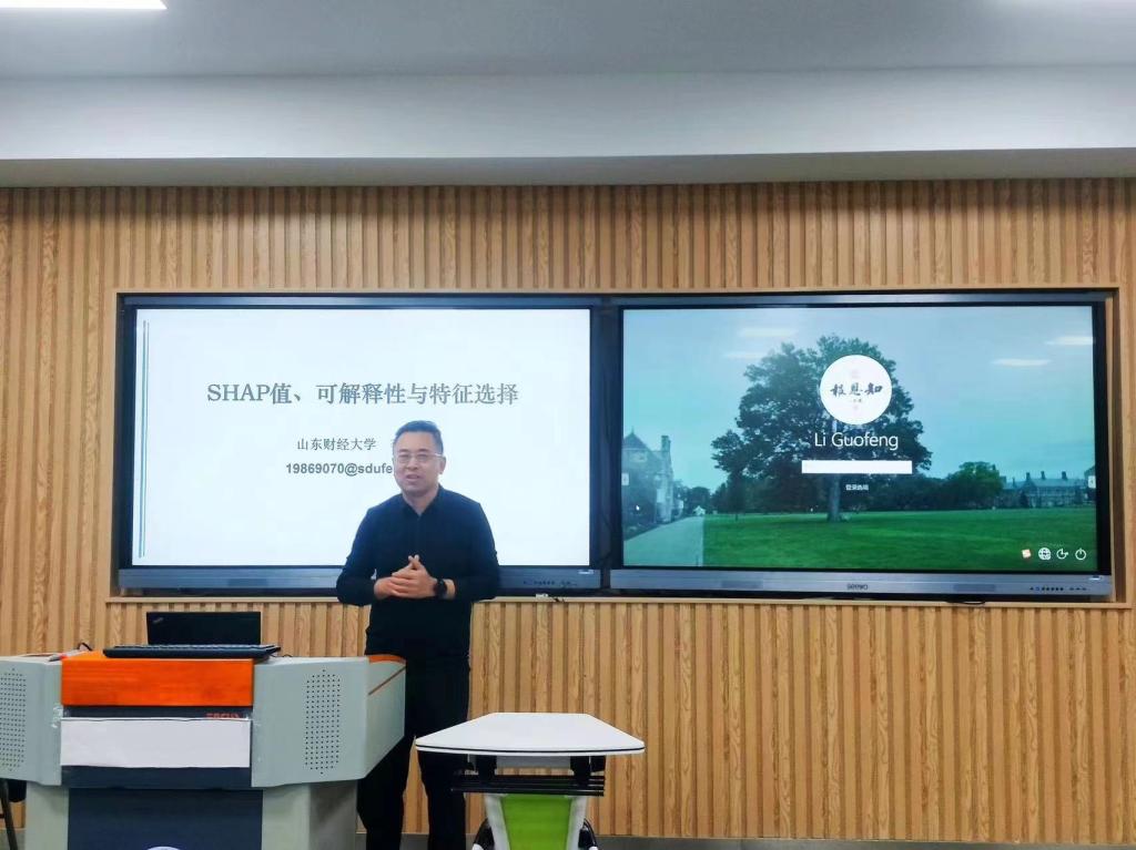 李国锋首先向同学们普及了机器学习的内涵、分类与算法耍素,其次讲解了特征工程的内涵与起点,以及特征选择的目的与方法,过程中通过与同学们的互动交流,提高了同学们对其的兴趣和理解深度。此外,结合案例详细为同学们讲解了SHAP值的思想及其原理。随后,利用Python为同学们演示了SHAP值的案例实现。最后,李教授总结了本次讲座的重点内容,并呼吁同学们自主学习并动手操作参与研究。