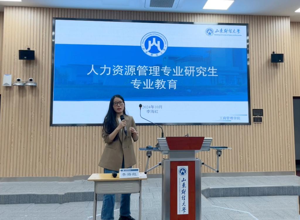 在逸夫楼103教室开展2024级研究生专业教育。学院副院长徐鹏,工商管理系主任、教学发展中心主任费振国,文化和旅游系主任于伟以及人力资源与组织行为系教师代表李海红出席。活动由学院党委副书记彭艳红主持,2024级全体研究生参加。
