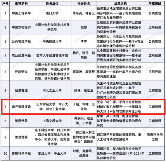 青年教师于超(第一作者)及其合作者发表在《南开管理评论》2023年第3期的论文《生态“树”源:平台生态系统的创新扩散机制研究——卡奥斯与科大讯飞平台的双案例对比分析》获评“案例研究典型成果”。