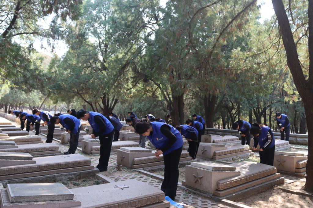烈士陵园墓区内,老师和同学们依次走到烈士墓碑前,献上手中鲜花,并致以深深鞠躬。祭扫过程中,师生们通力协作,对墓碑周边环境进行仔细清理,认真清扫落叶、杂物,让烈士安息之地始终保持整洁,以实际行动表达对革命先烈的敬仰。