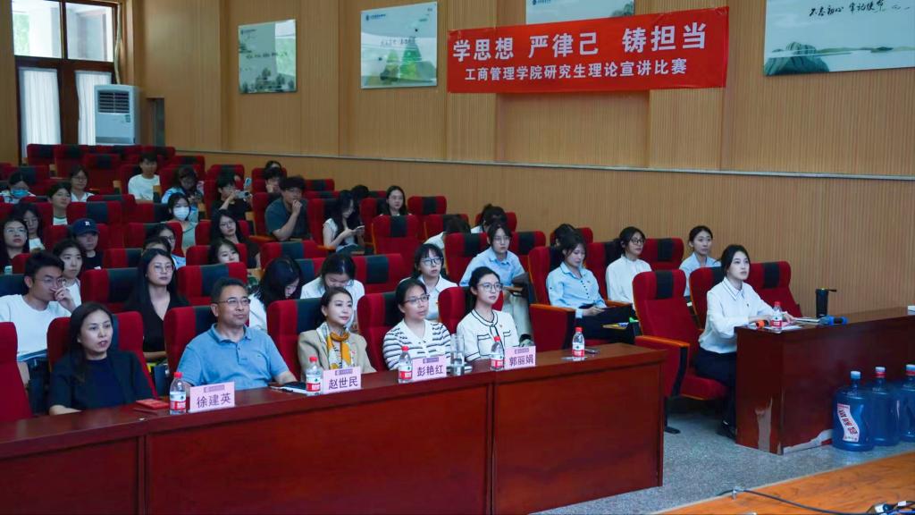 在3号楼报告厅举办“学思想 严律己 铸担当”研究生理论宣讲比赛。学院党委书记赵世民、副书记彭艳红、辅导员徐建英、郭丽娟及研一、研二全体研究生参加。