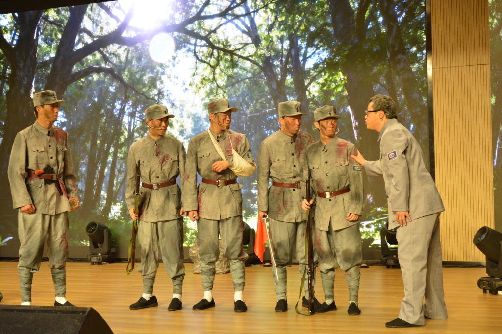 山东管理学院艺术学院师生带来了小剧《庆功酒》。剧情带领师生穿越时空连接1945年抗战的烽火与新时代的和平,通过一瓶尘封的老酒,揭开了一段关于承诺与牺牲的壮烈记忆,让观众在感动中铭记历史、珍爱和平。
