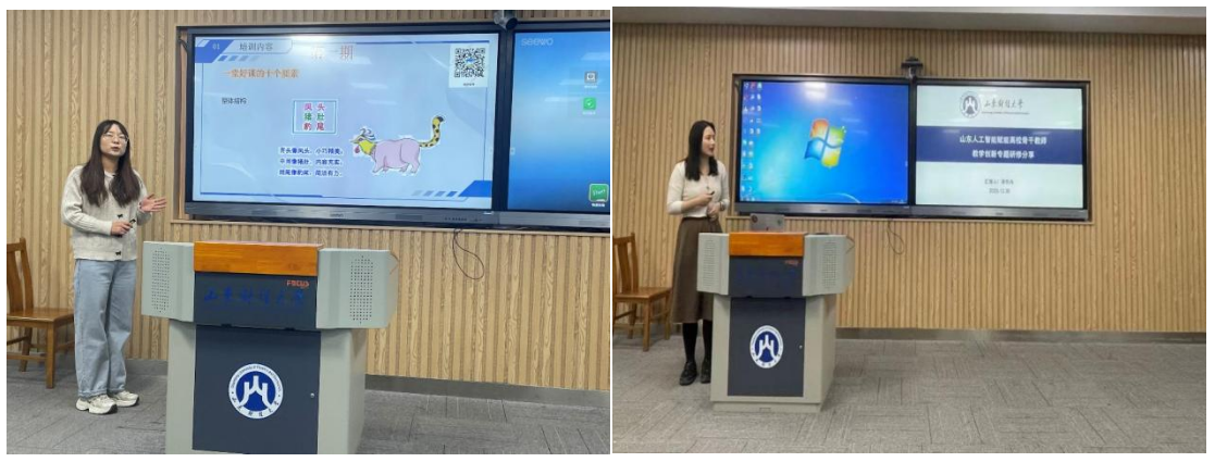 分享环节两位参训青年教师结合各自的培训内容进行了30分钟的展示分享。绳鸿燕老师围绕在北京外国语大学参加的高校青年教师教学能力提升示范培训,交流了心得体会,并就如何增强教学互动性、参与度与有效性等内容展开分享,为参加活动的青年教师提供了有益借鉴。吴忻冉老师分享了在武汉大学参加的“山东人工智能赋能高校骨干教师教学创新专题研究”的培训感悟,系统阐述了人工智能在“教、学、管、评”四个维度的应用价值,并对AI技术助力教师教学能力提升的路径进行了交流探讨。