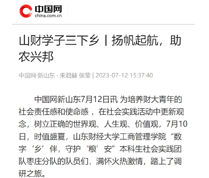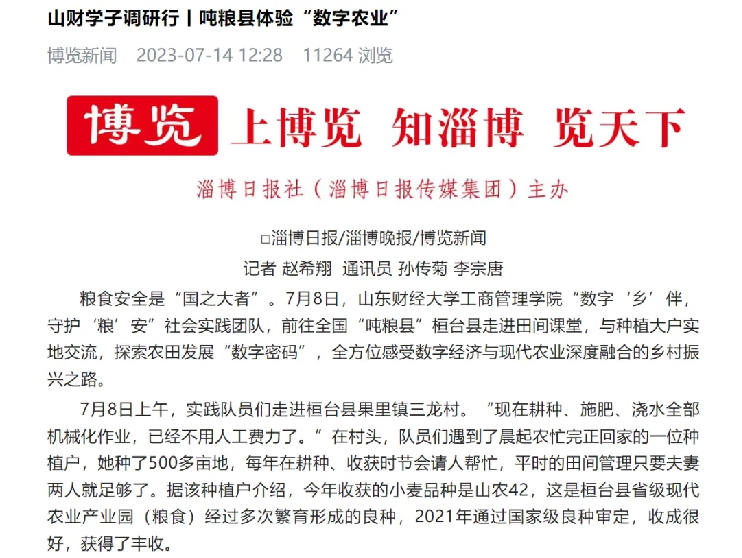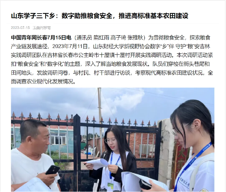 7月初,性爱网站 新视野协会“数字‘乡’伴,守护‘粮’安”社会实践团队,满怀火热激情,踏上了三下乡调研之旅。活动紧扣“粮食安全数字化”的主题,深入了解当地粮食发展现状。队员们穿梭在街头巷尾和田间地头,发放调研问卷,与村民、村干部进行访谈,考察现代高标准农田建设状况,考察深入,方法多样,扎实调研,在炎热的夏日交出累累硕果,被中国青年网、中国网、淄博日报等多家媒体报道。