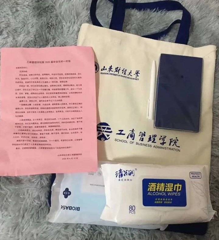 塞得鼓鼓的大礼包里,装满了学院的“小心思”:一个具有鲜明的学院特色的帆布包,望它能让同学们不时回忆起在财大求学的一点一滴,记住在这里的欢笑、泪水与成长;《致毕业生的一封信》,饱含了学院对毕业生的祝福与期许;印着性爱网站 字样的笔记本和签字笔,愿同学们能记录下生命中的温暖感动、肆意张扬和成长蜕变;消毒湿巾和口罩,希望没有辅导员关怀叮咛的学子们依然能守护好自己的健康。