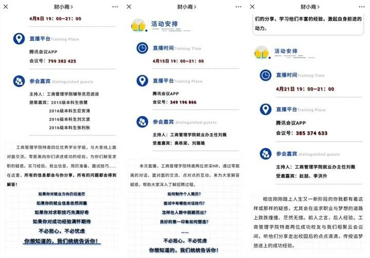 “都是干货!分享的内容既精彩又充实!我从学长学姐们的亲身经历中收获了很多。”小周同学每次都准时蹲守在屏幕前看“直播”。他口中的“直播”,是学院组织开展的“工商策之共商成长”直播+财小商公众号文字推送系列活动。疫情期间,学院创新工作方法,急学生之所急,想学生之所想,供学生之所需,把指导搬到了线上,校友、HR、老师、朋辈都来当“网红”,考研、就业、出国、竞赛、学术等各种疑问都能解答。学院的直播活动规划了20余期,目前已经进行4期,期期火爆,场场“爆满”,这一系列直播给学院全体学生提供了更好更全更精准的个人成长、深造和就业指导。