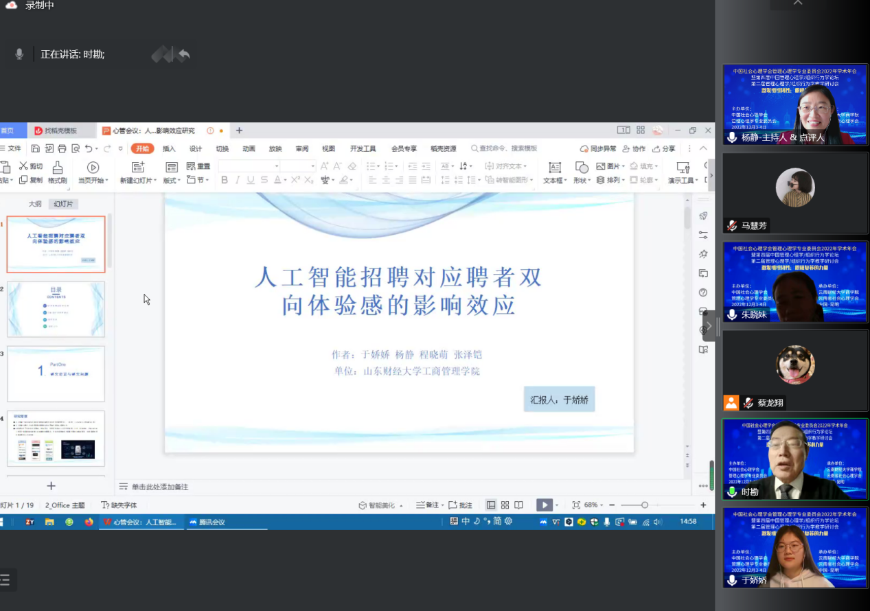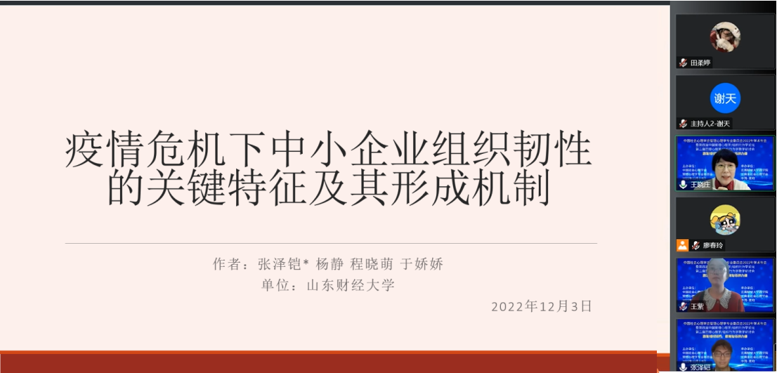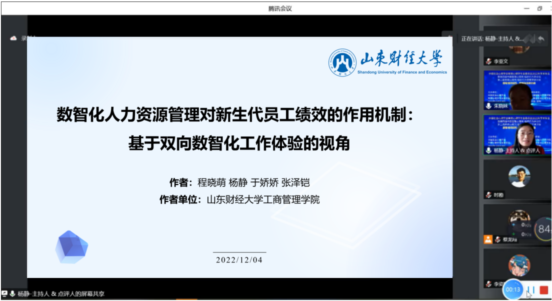 本届年会共设有6场大会主题报告、17场专题论坛、1场论文发表工作坊以及1场组织行为学教学研讨会。其中,2020级人力资源管理专业研究生张泽铠、程晓萌和2021级企业管理专业研究生于娇娇3位同学分别作为发言代表报告团队最新研究成果。张泽铠在12月3日下午的专题论坛二汇报了主题为《疫情危机下中小企业组织韧性的关键特征及其形成机制》的研究论文。该研究基于过程与能力的整合视角运用跨案例分析构建出疫情危机下中小企业组织韧性的关键特征及形成机制。于娇娇在12月4日下午的专题论坛十三汇报分享了主题为《人工智能招聘对应聘者体验感的影响效应》的最新研究。该研究采用定性与定量研究相结合的混合研究设计来探究并验证人工智能招聘对应聘者体验感的影响效应。程晓萌由于在回家途中无法在线汇报,由杨静副教授代为在专题论坛十三汇报论文《数智化人力资源管理对新生代员工绩效的作用机制:基于双向数智化工作体验的视角》。该文研究发现数智化人力资源管理对新生代员工的数智化工作体验产生积极和消极的双向影响效应,并通过积极数智化工作体验会提升新生代员工的任务绩效和创新绩效;通过消极数智化工作体验会降低新生代员工的任务绩效和创新绩效。参会师生与本届论坛的学界同仁进行了深入的交流与研讨,并受到点评专家对文章的高度评价与宝贵的优化建议。